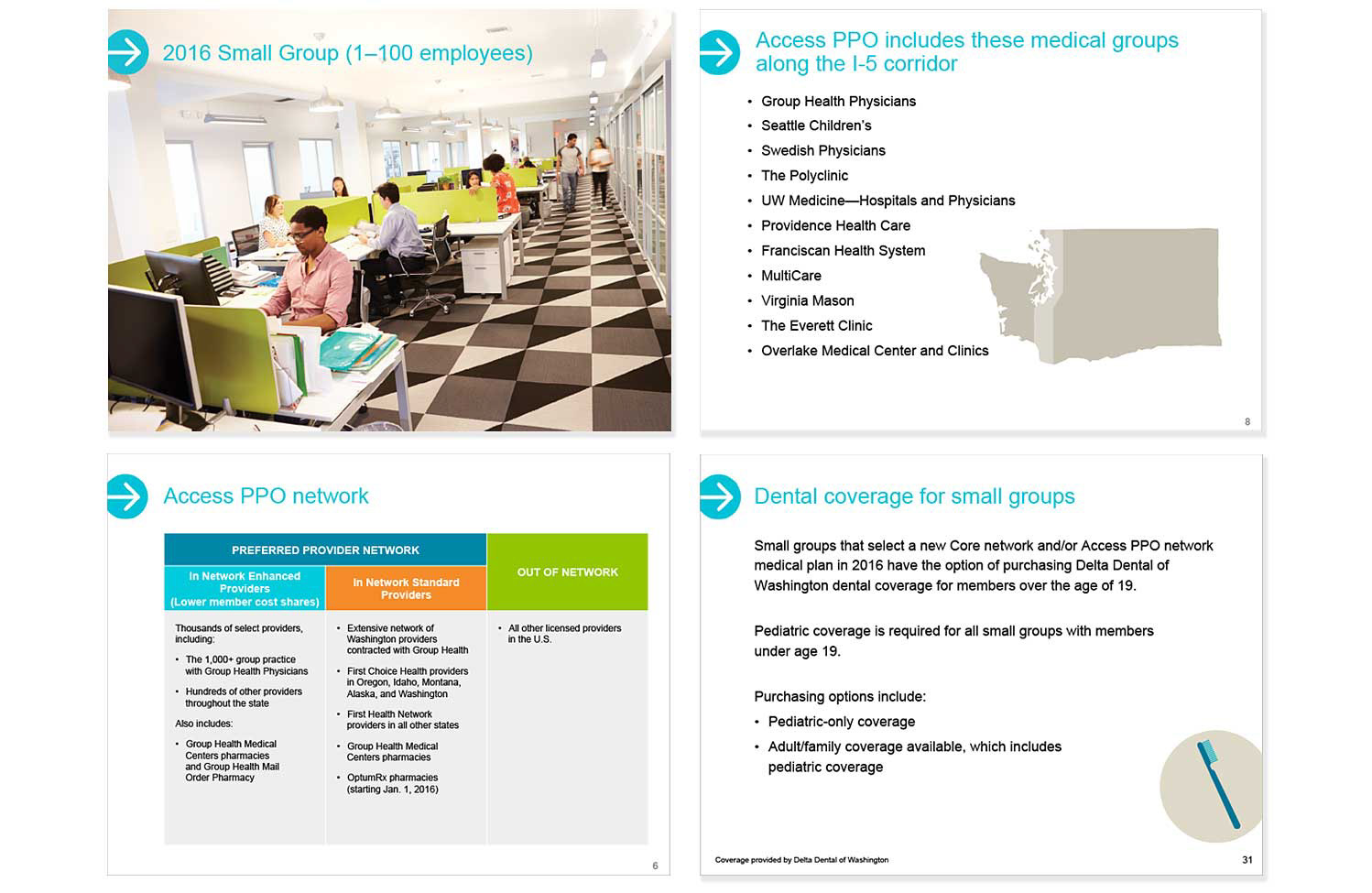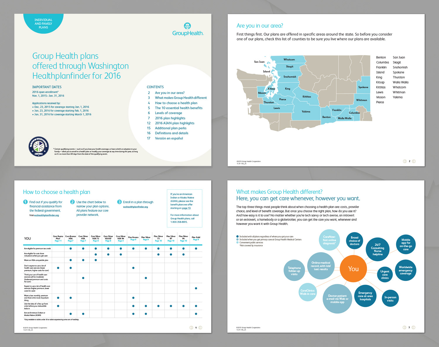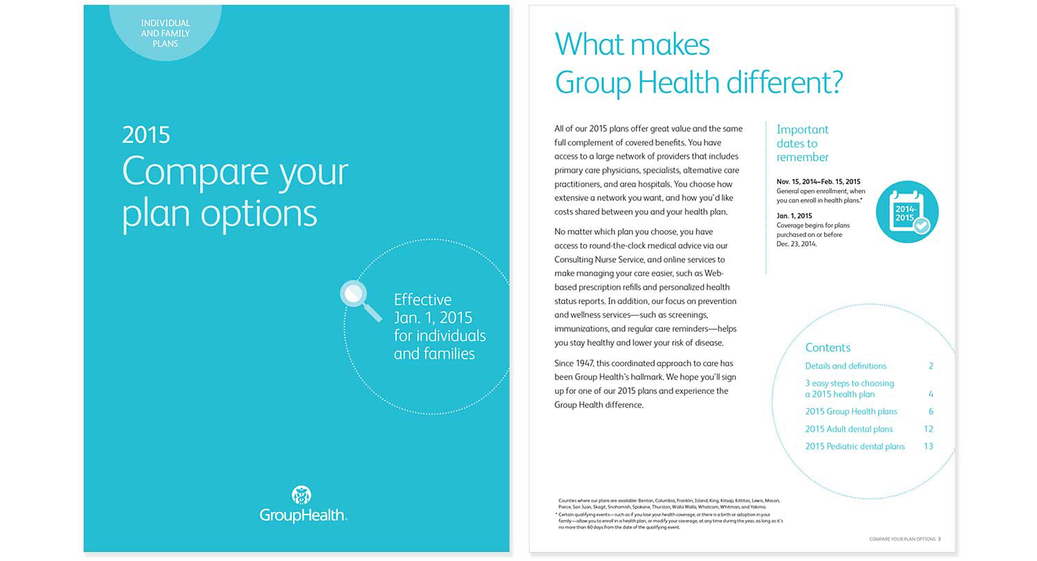 The months leading up to open enrollment are a busy time with health organizations. I contracted with Group Health as a designer to assist the team in preparing a variety of materials. I was also in place to help during their transition to become Kaiser Permanente.