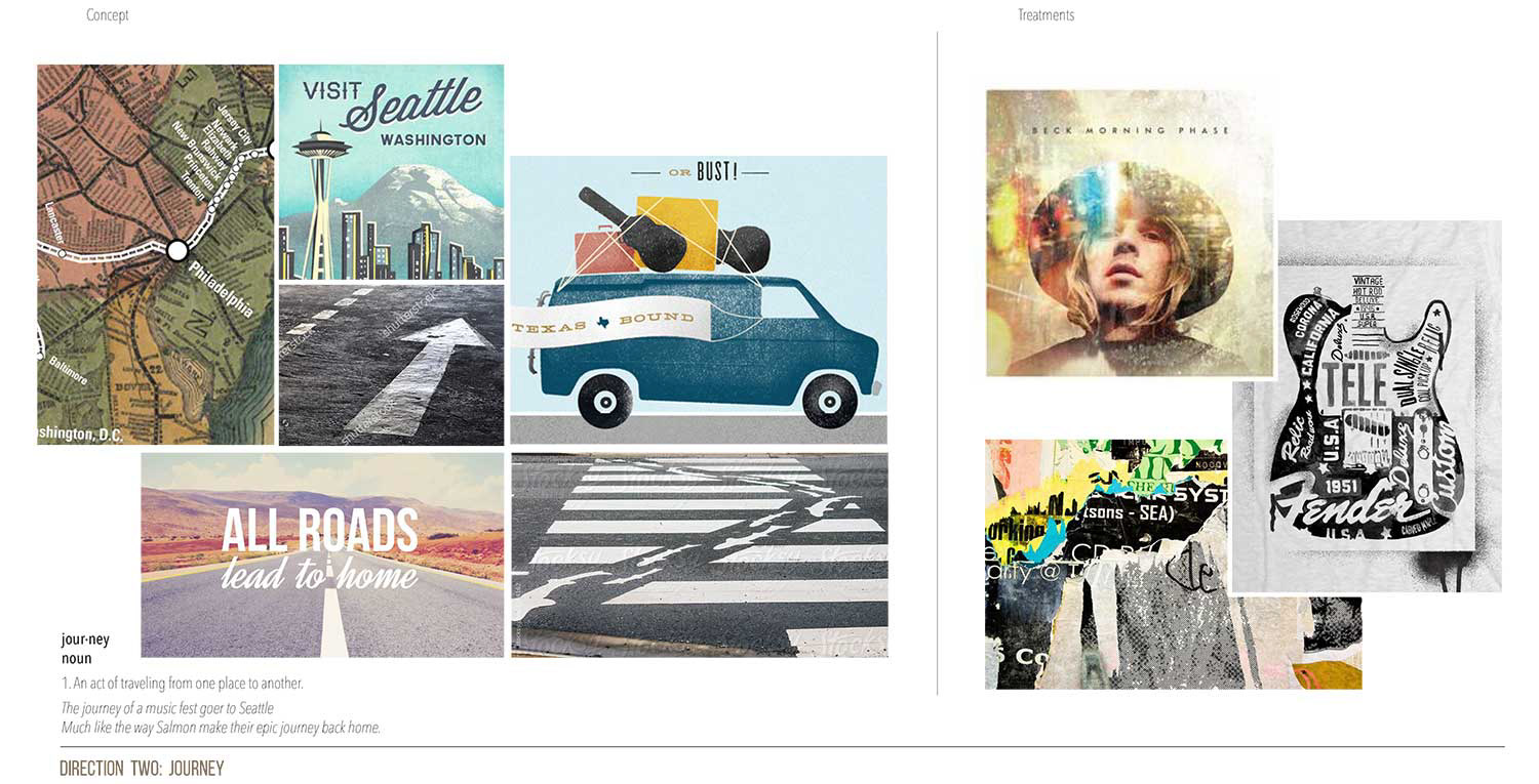 Concept 2 – Journey: I thought of the journey a music festival goer might take to arrive in Seattle.