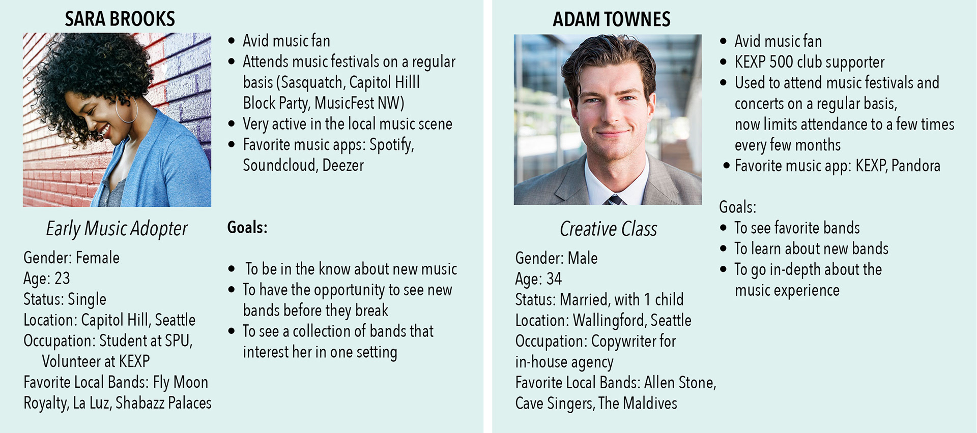 I created two personas based on the profiles that the Stakeholder had provided: “Early Music Adopters” and “Creative Class”.
