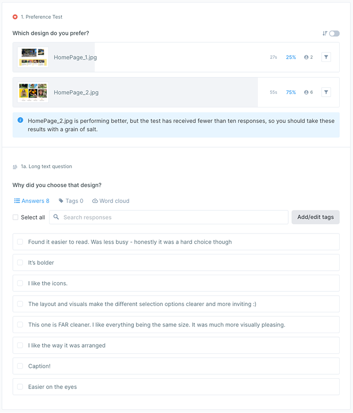 I tested the existing homepage (Design #1) against mine (Design #2) utilizing a comparison test at UsabilityHub: