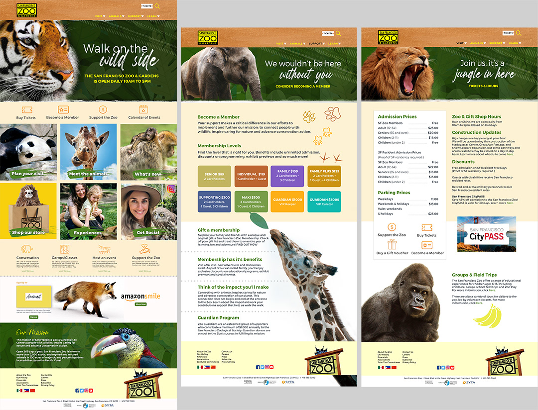 The assignment was to give the San Francisco Zoo website a visual design refresh. This would be achieved by defining a new design language and applying the four attributes of good design (Contrast, Repetition, Alignment and Proximity). I selected three pages: Home, Member and Tickets to redesign.