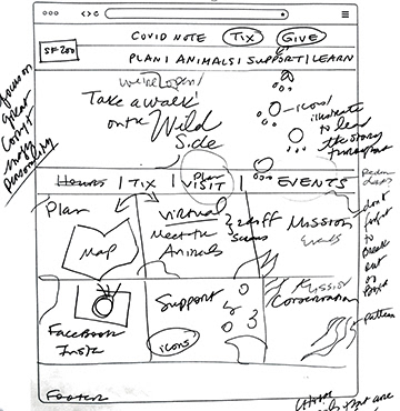 User Journey: A parent goes to site, (maybe with a child on their lap). The child is drawn to the wonderful, colorful images of animals. And the parent is inspired by their kids’ reactions to look for pertinent info to plan their trip, find out hours, ticket prices and perhaps join as a member. They navigate through each section on the home page, and then click on ticket prices to get more information. After reviewing the calendar, tickets are purchased. They also click on the membership tab with interest to support the zoo. They decide to consider a membership at a later time, perhaps sharing the information with other parents.