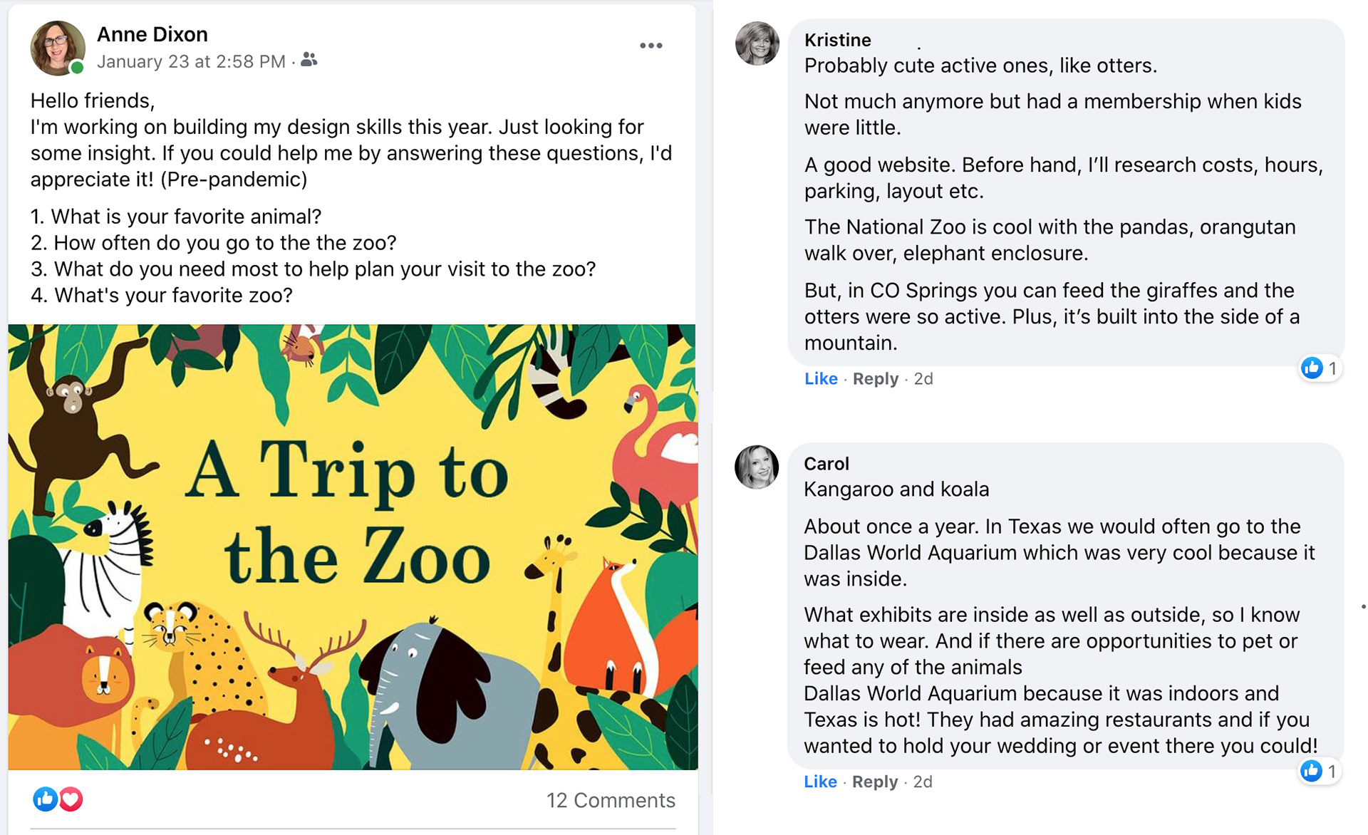 To begin the exercise, I reviewed other zoo sites for inspiration. I read about the top ten animals at the zoo. For fun, I watched the movie "We Bought A Zoo". In addition I did a brief Facebook survey among friends to gather their thoughts: